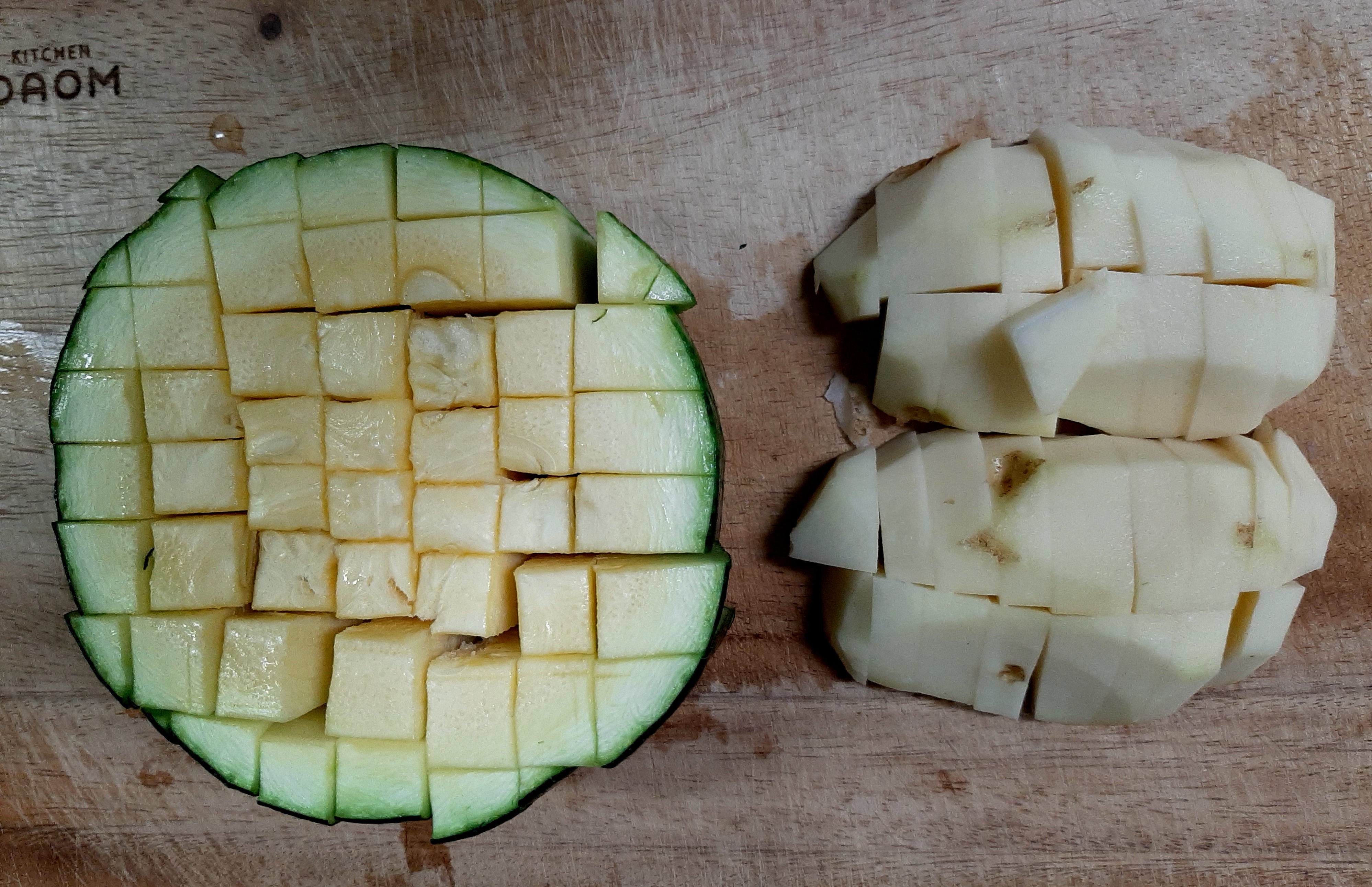 감자와 호박을 볶은 후 라면과 같이 끓여요