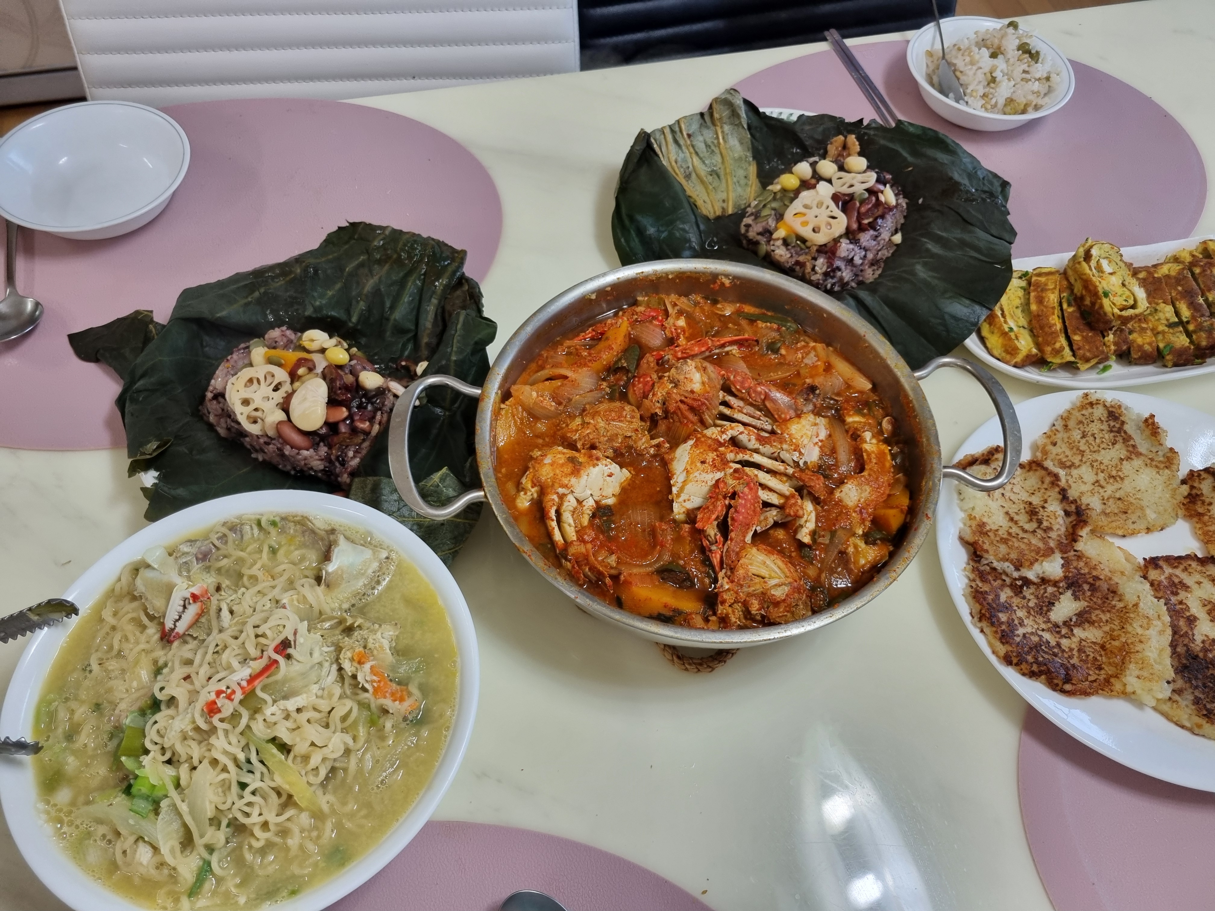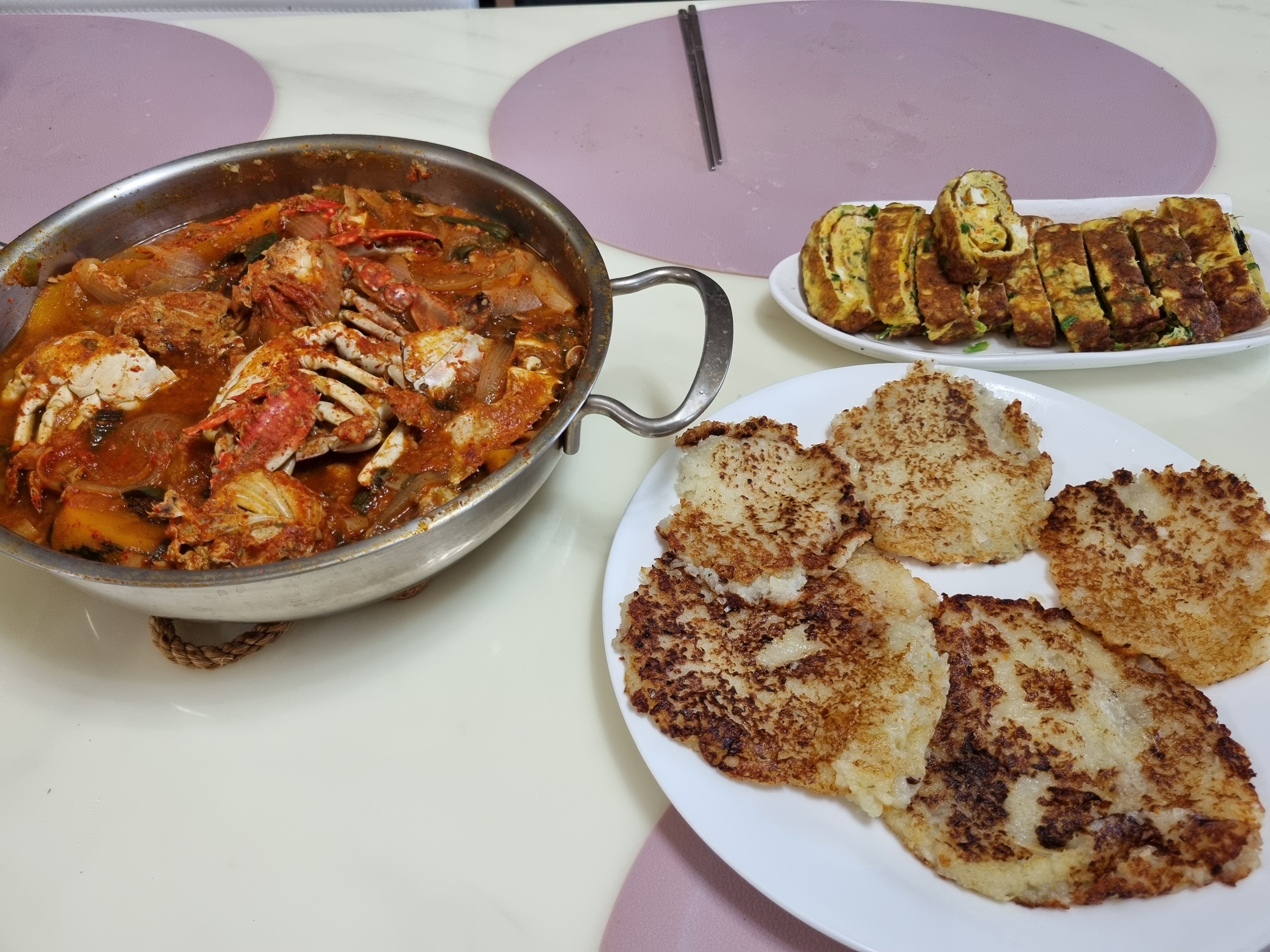 꽃게찌개,꽃게라면,계란말이,감자전
