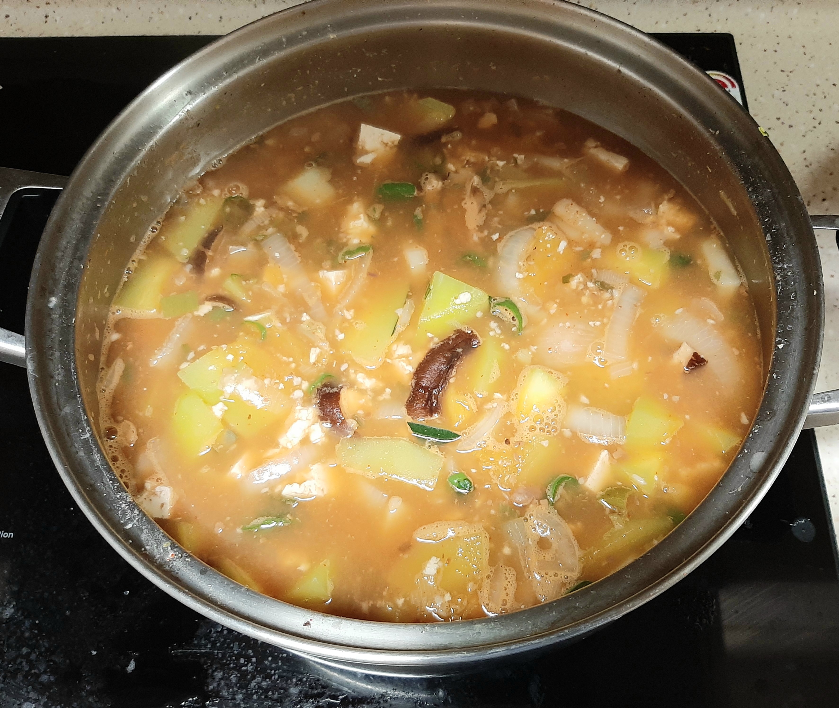 미리준비한 육수에 녹아든 레시피, 표고버섯,간마늘,된장,고추장,청고추,대파를 추가로 더 넣고 푹~욱 끓여요