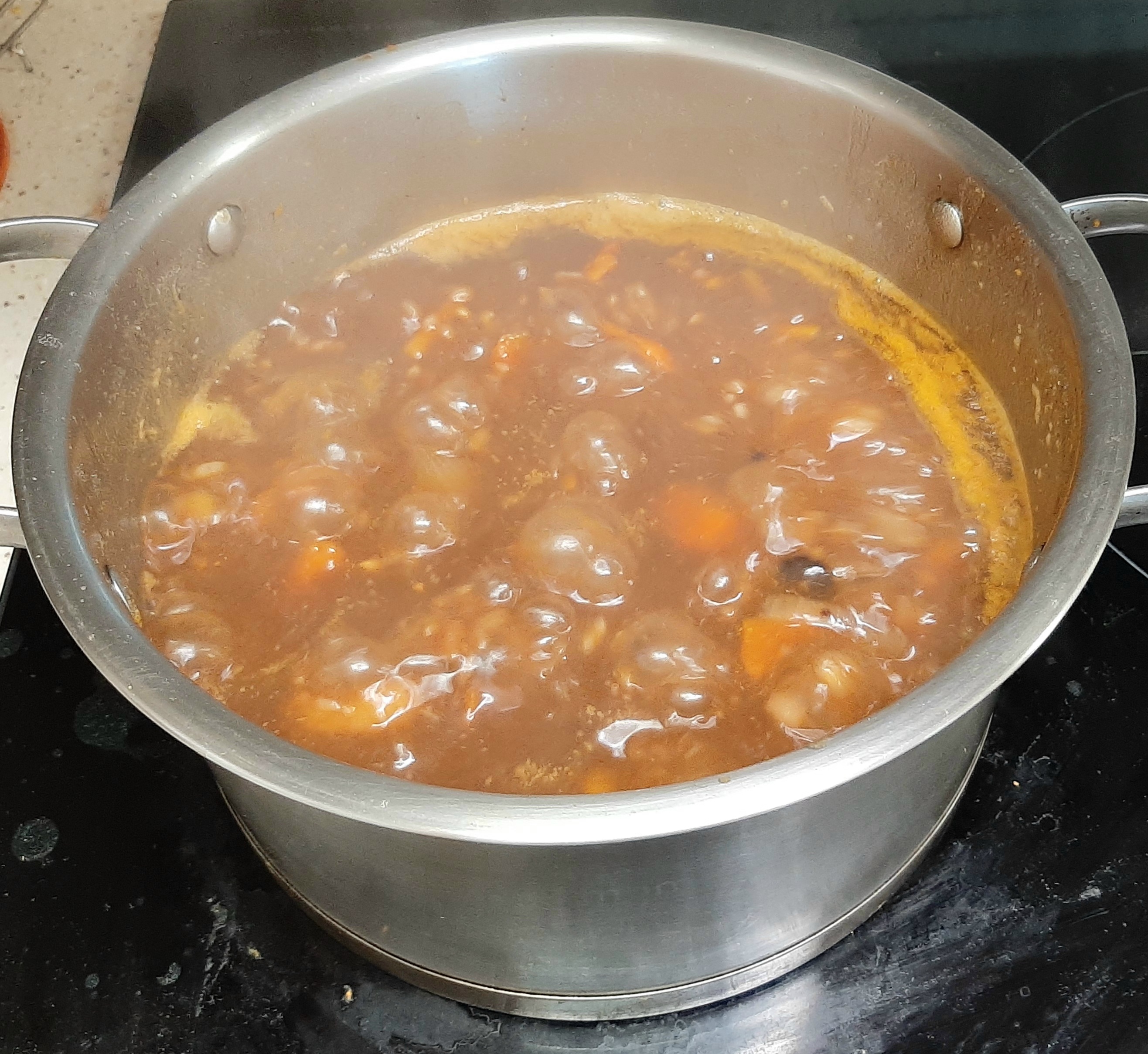 레시피로는 돼지고기, 단호박, 짜장분말,감자,당근,양파,마늘쫑,간마늘,찰보리쌀밥,물입니다.^^
