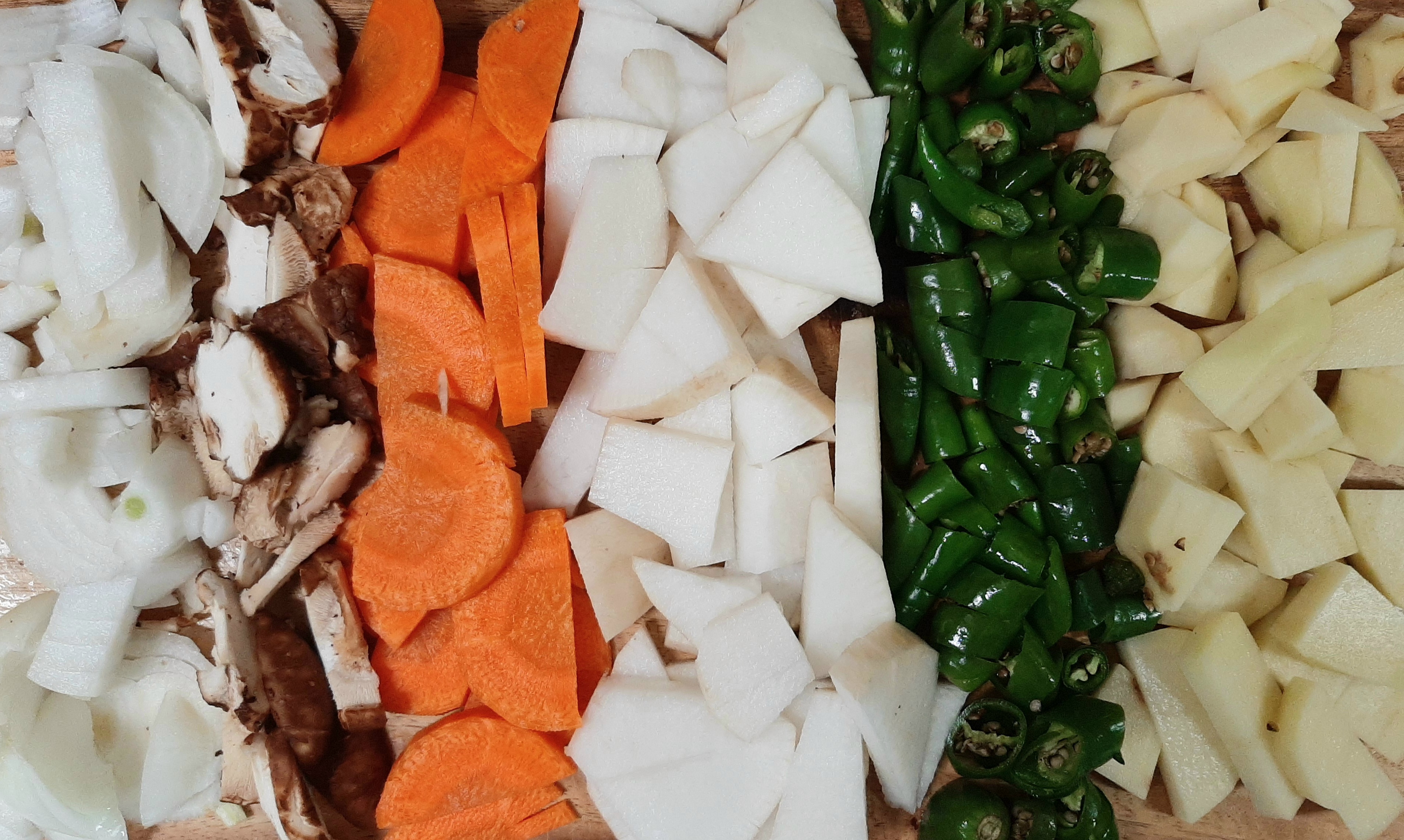 레시피로 준비한 감자,청고추,무우,당근,표고버섯,양파,멸치