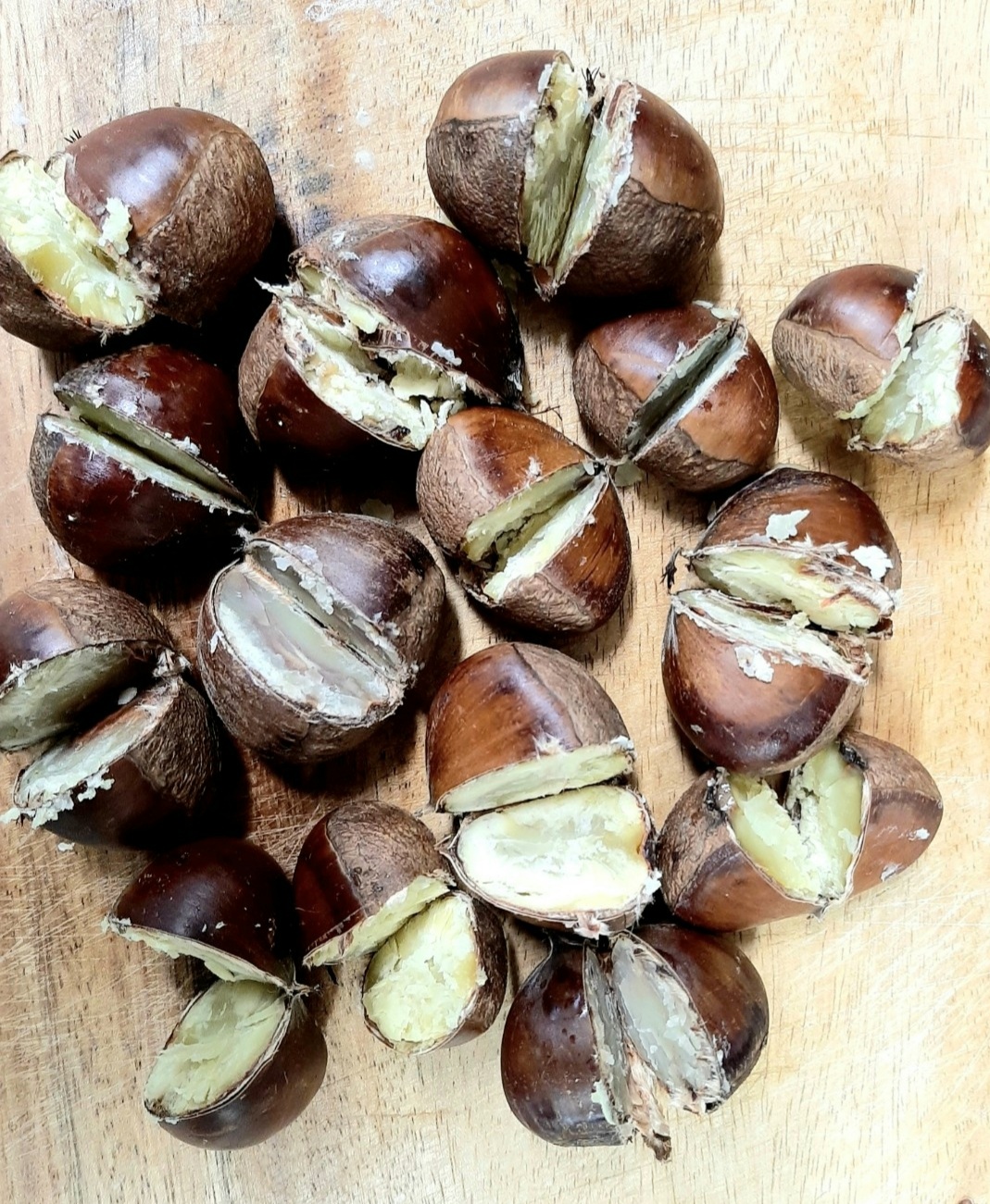 싱싱한 밤을 솥에 삶아서 꺼내 후 2등분하여
