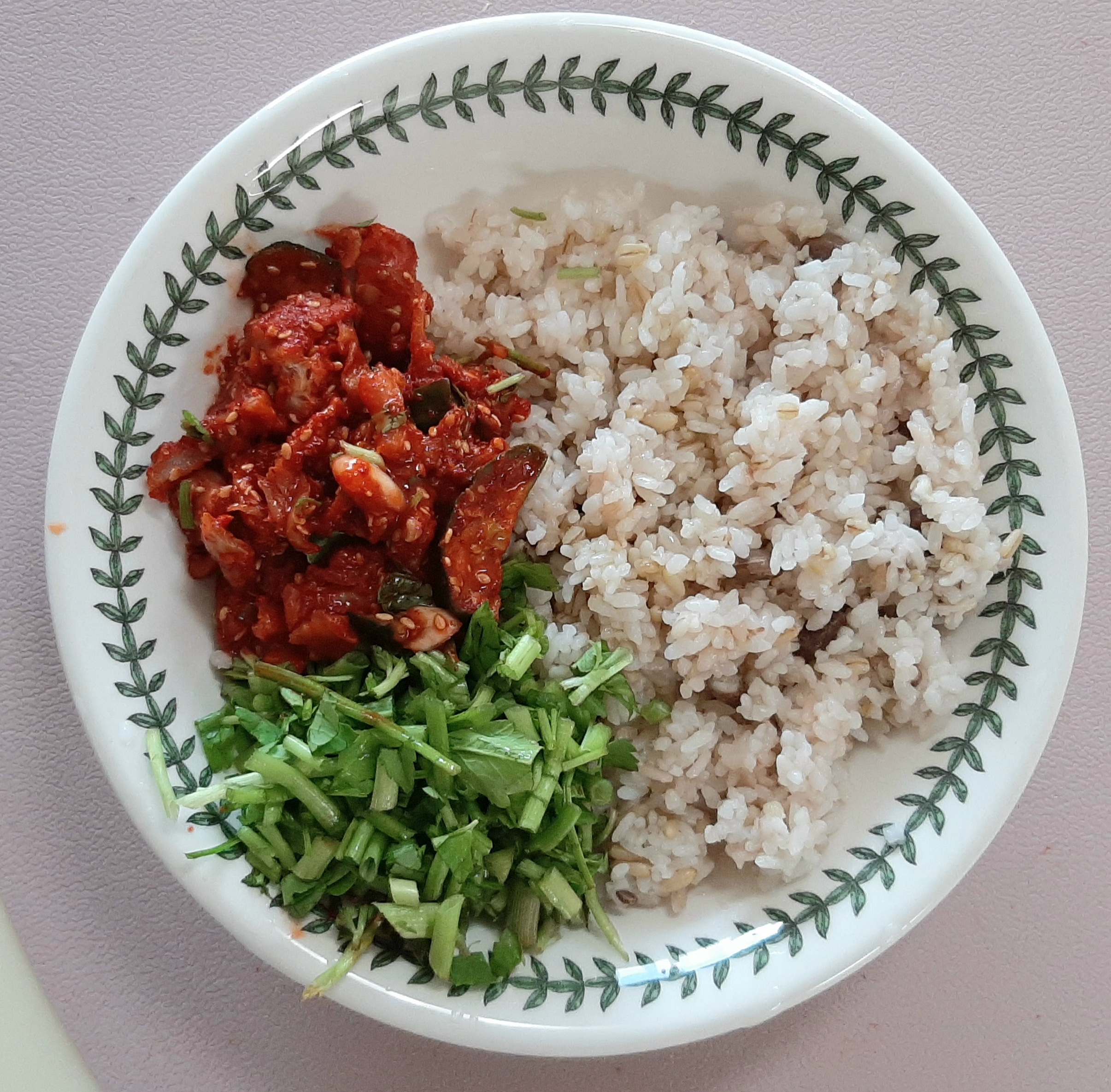 이 두가지 종류에 추가로 들기름을 찰보리쌀밥에 넣고 정성스럽게 비벼 "홍어 미나리 비빔밥(제273호)"으로 먹거리 준비를...^^