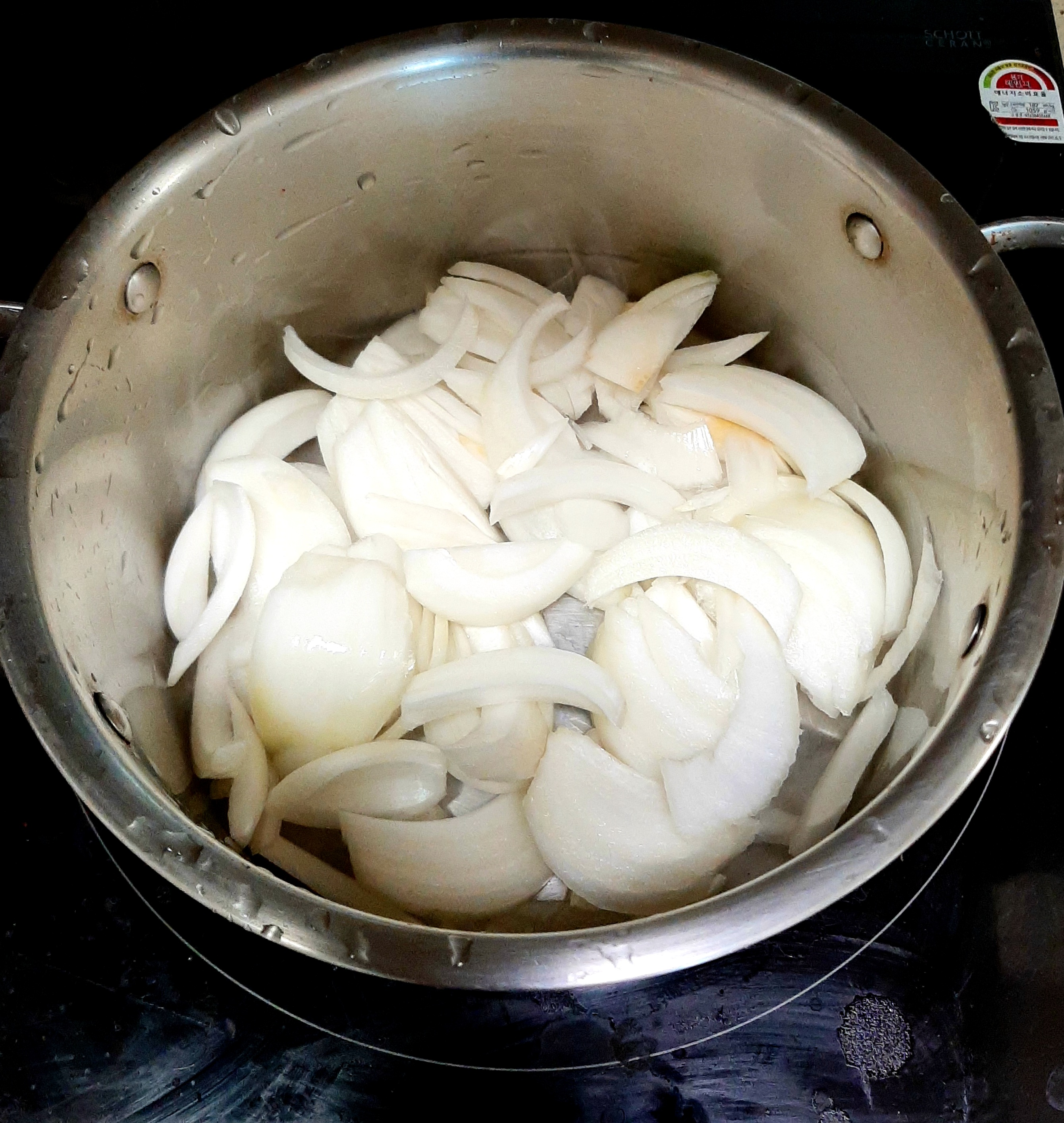 양파를 먼저 넣고 그 위에 올리브유를 뿌려서 볶아요