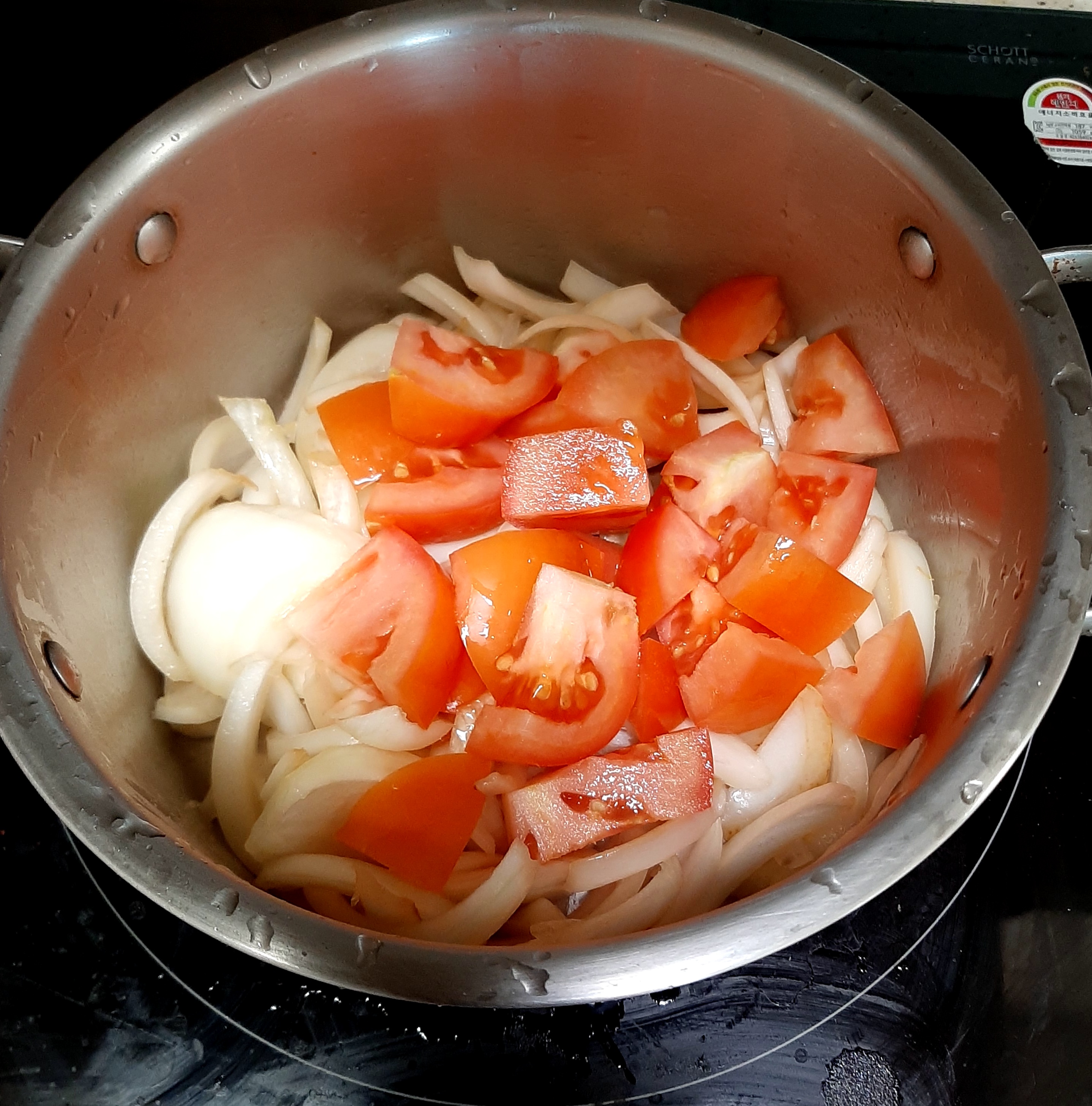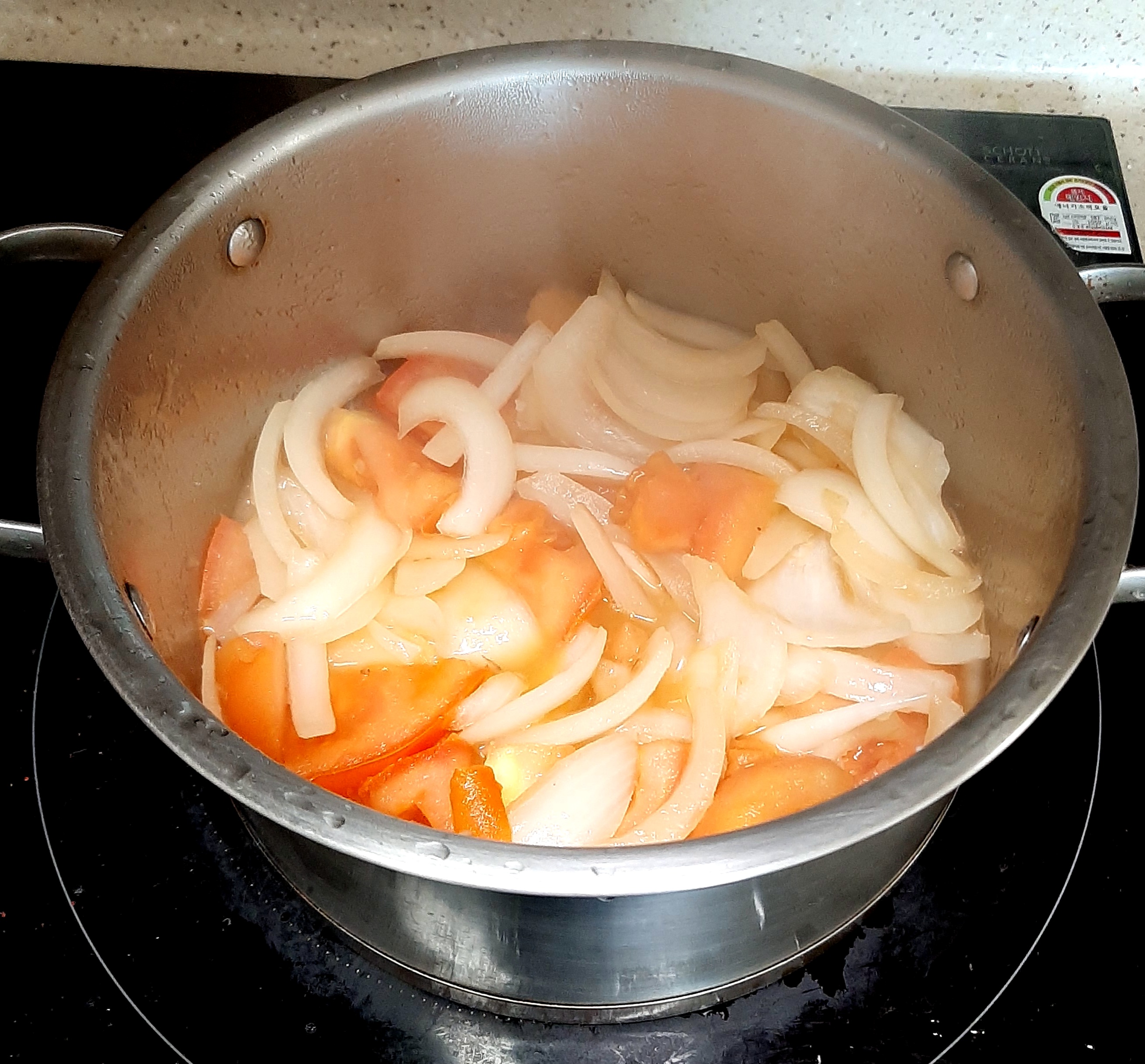 양파,토마토,올리브유,소금을 넣고 약한 불에 볶아요.