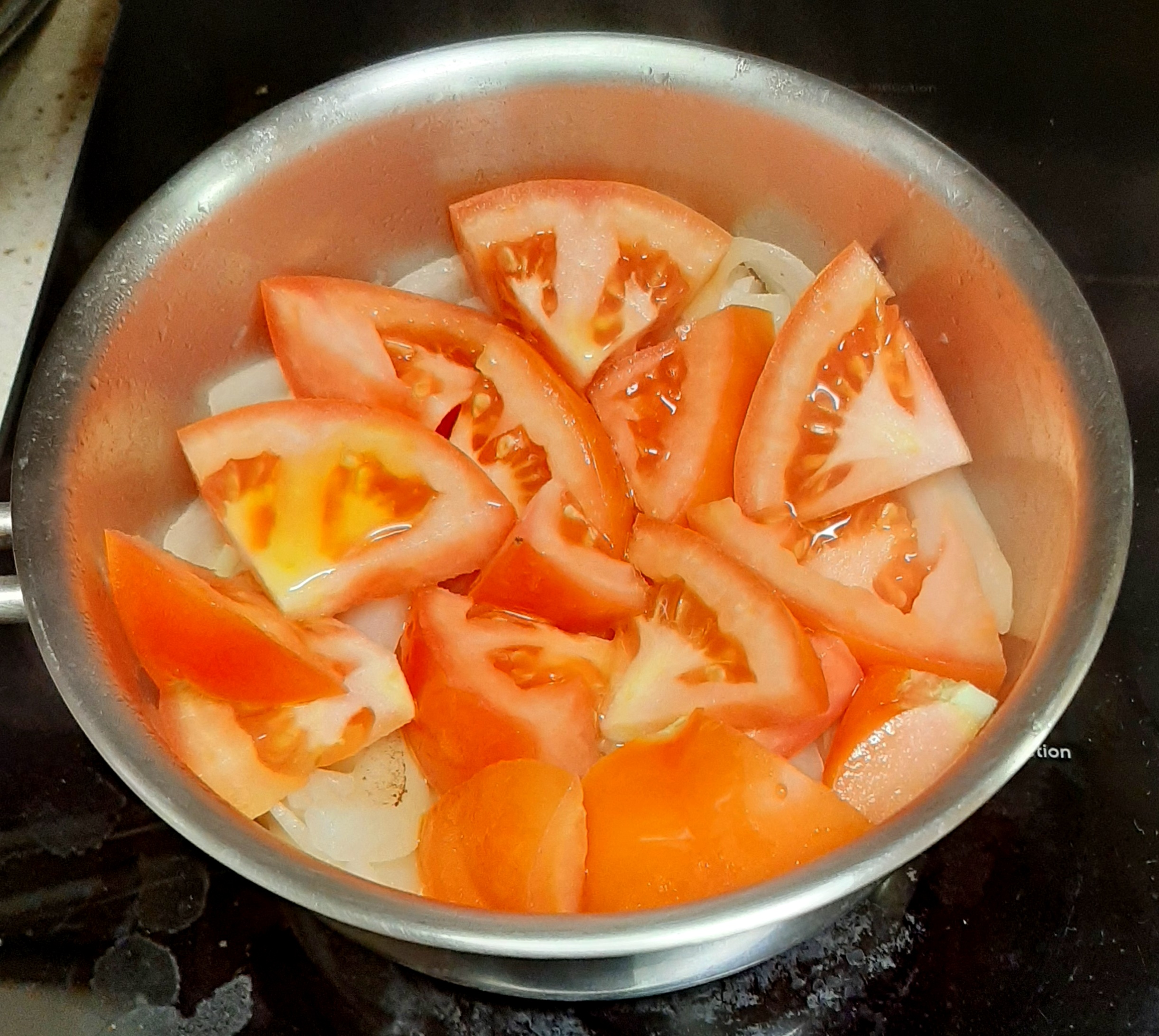 볶여지는 양파 위에 자른 토마토 두 개를 넣고 올리브유 한 번 더 뿌리고