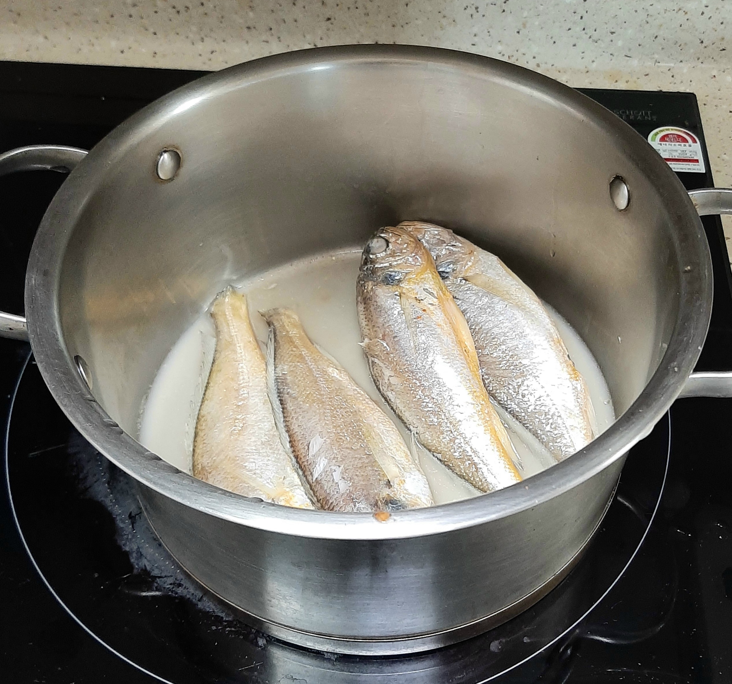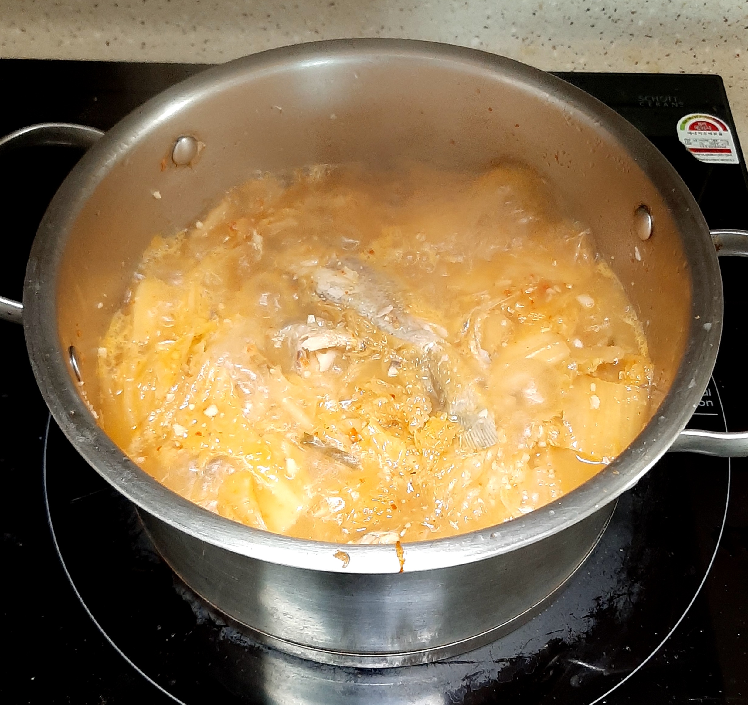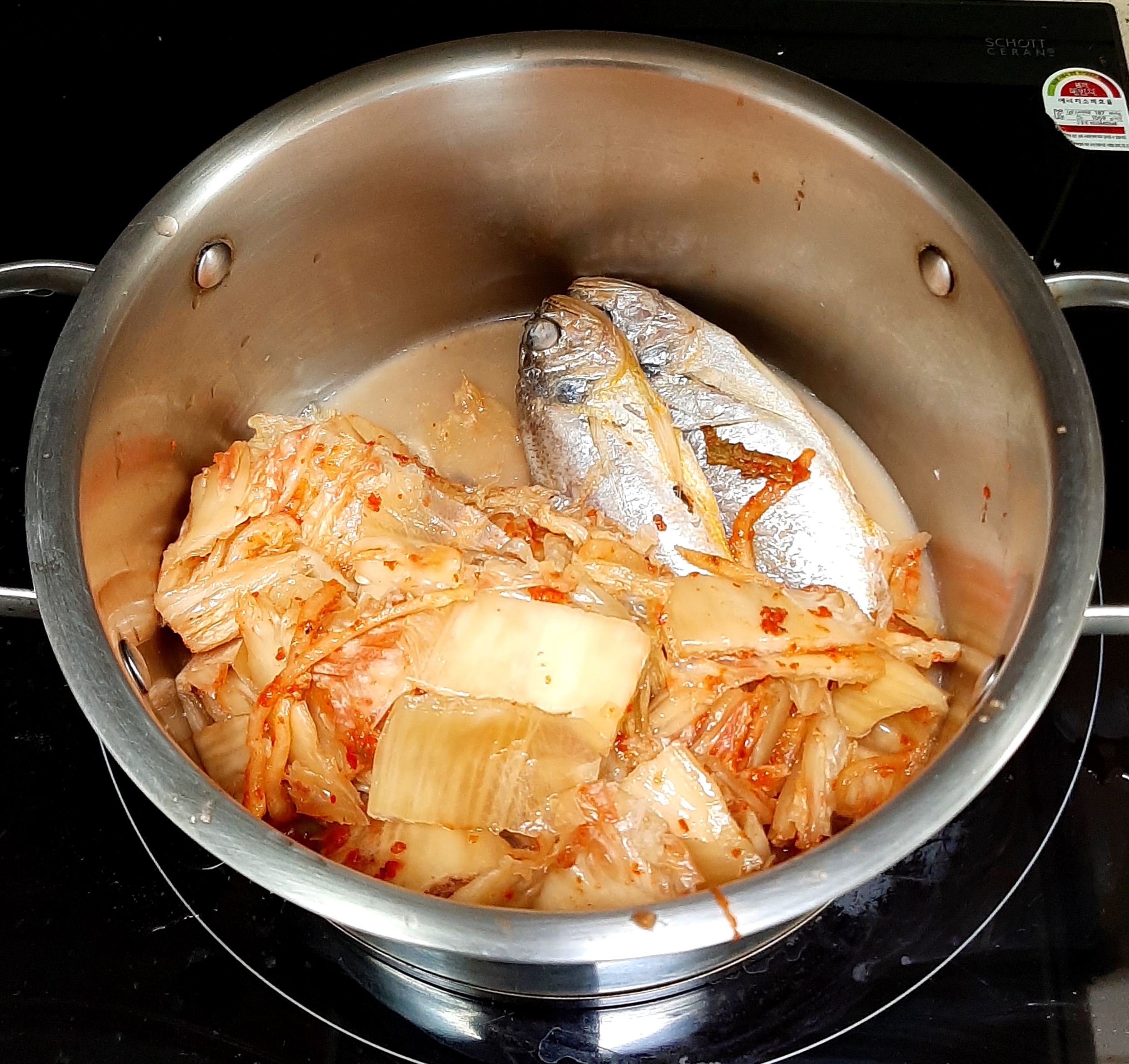 레시피로는 가격이 비싼 조기 4마리, 흐르는 물에 세척한 묵은지,간마늘,생강술, 물이죠.^^