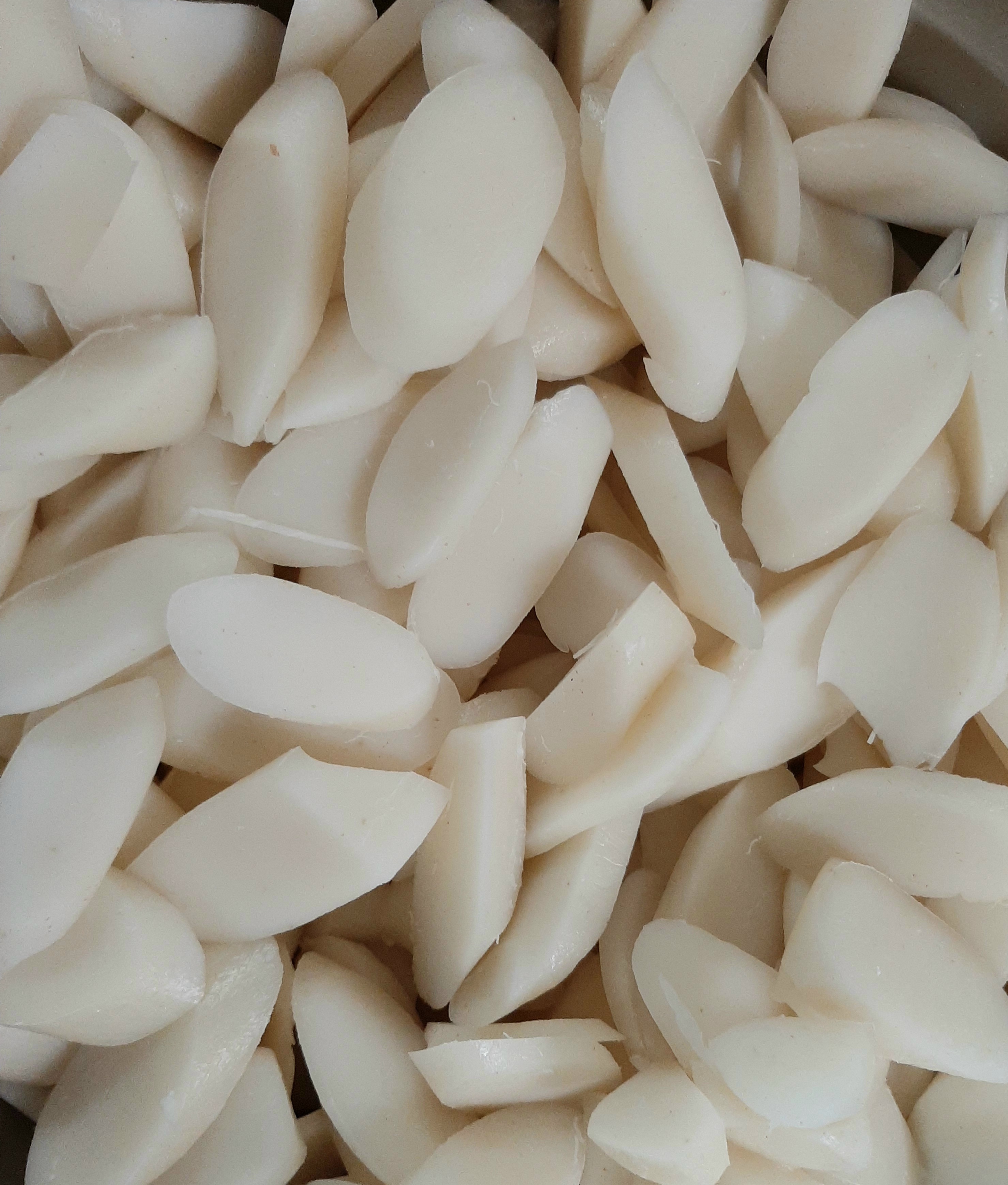 고향땅 논에서 추수한 벼로 떡방아간( )에 직접가서 가래떡을 뽑아와 하루밤 건조후 도마 위에 놓고 절단하여 고향 향기가 물씬나는 "닭고기 떡국(제291호)"을 끓였어요.^^