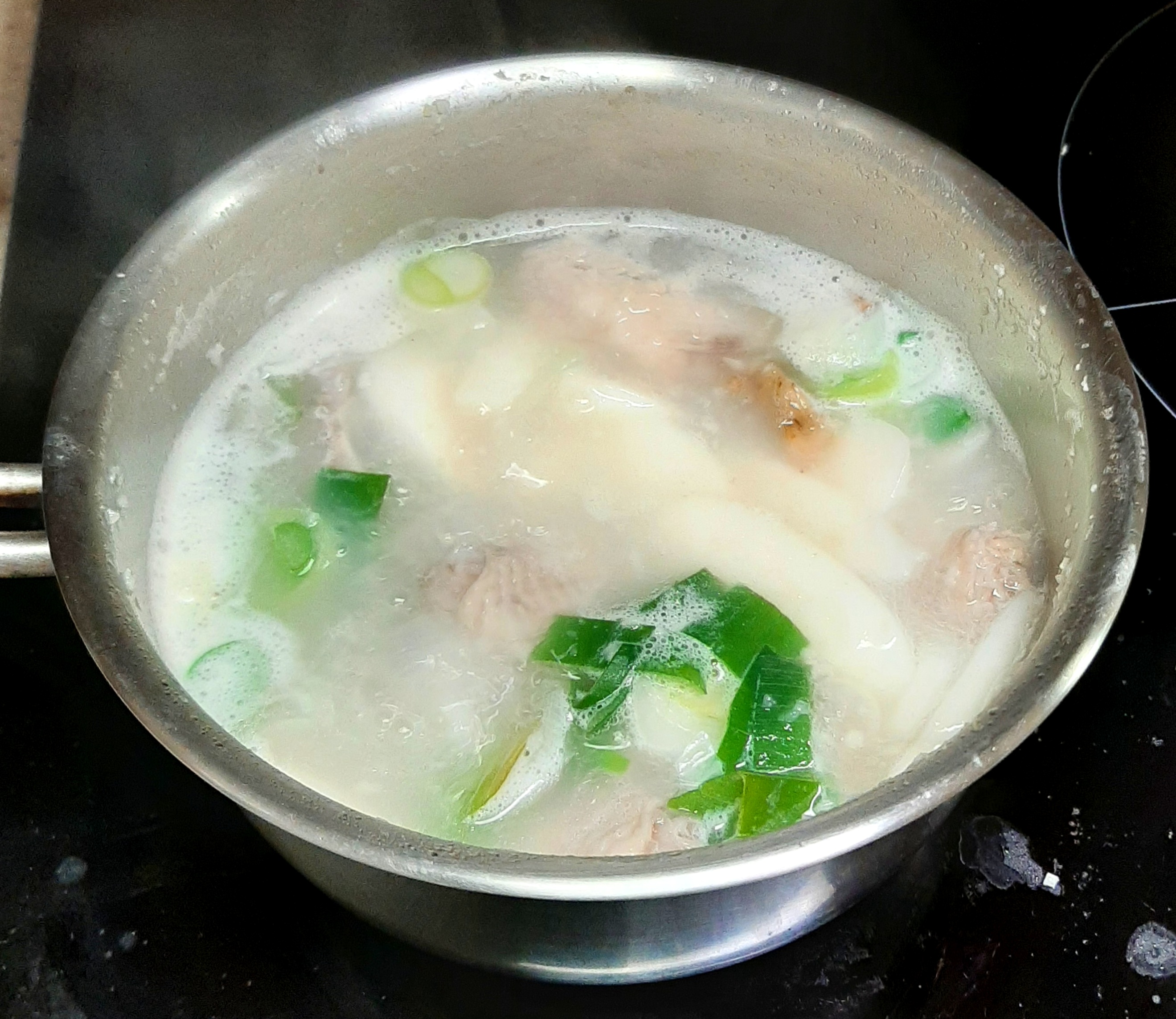 떡국,닭윙,인삼,간마늘,대파,생강술,소금,물을 혼합하여 더 끓이고
