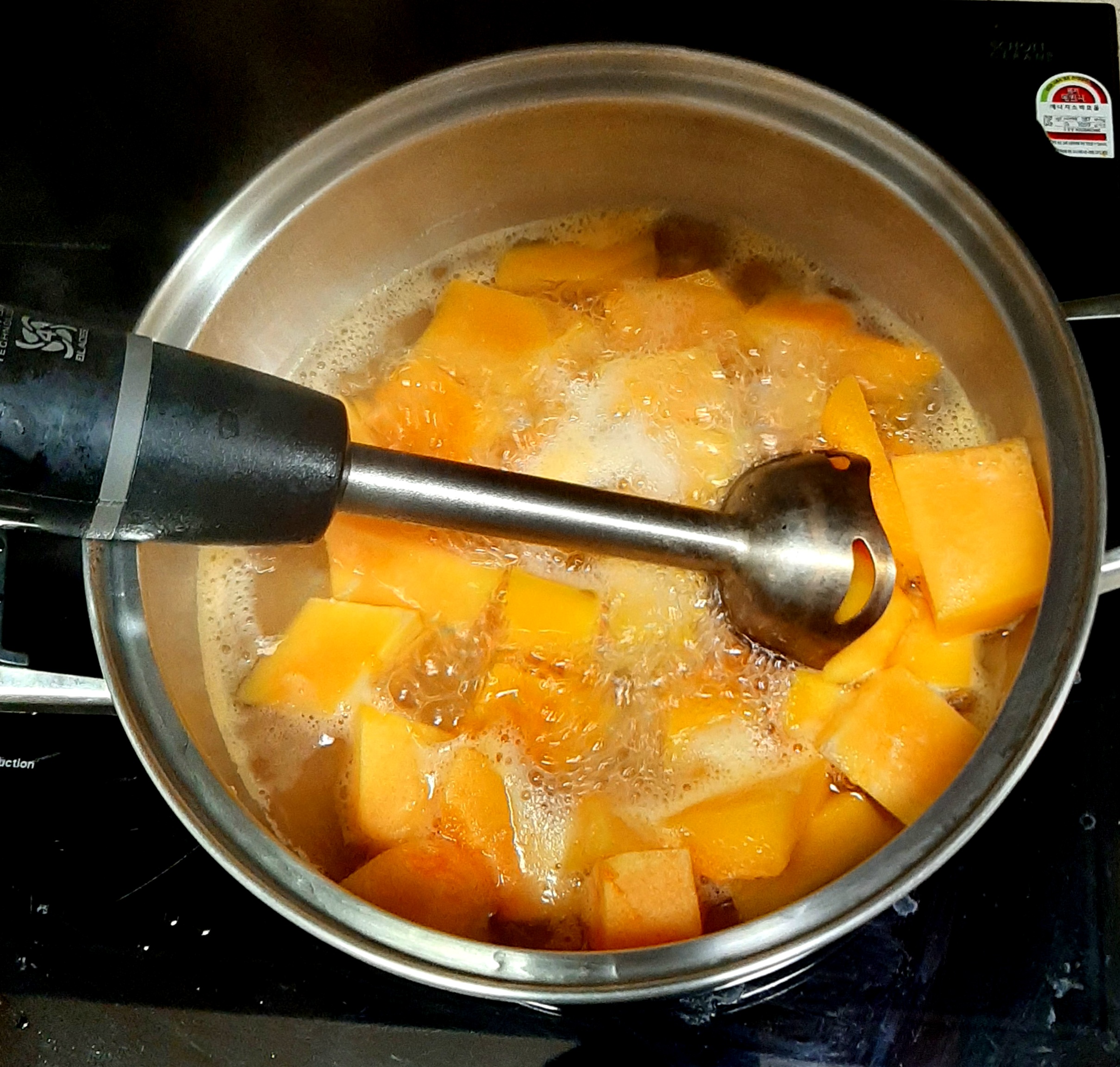 삶은 호박을 핸드블렌더 또는 믹서로 곱게 갈아줍니다.