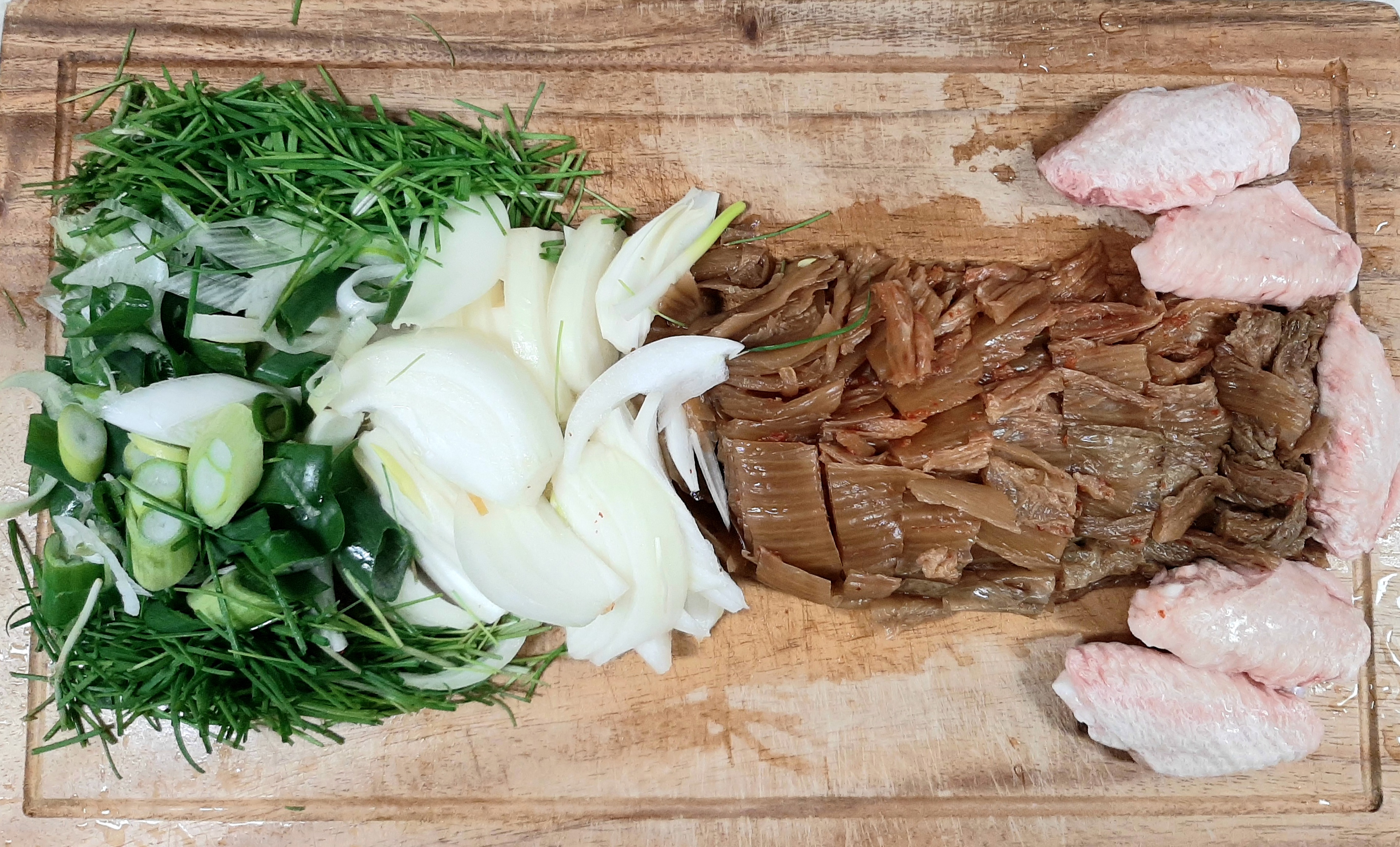 2년 묵은 배추김치묵은지,닭윙(닭날개),양파,대파,베란다 텃밭 달래,