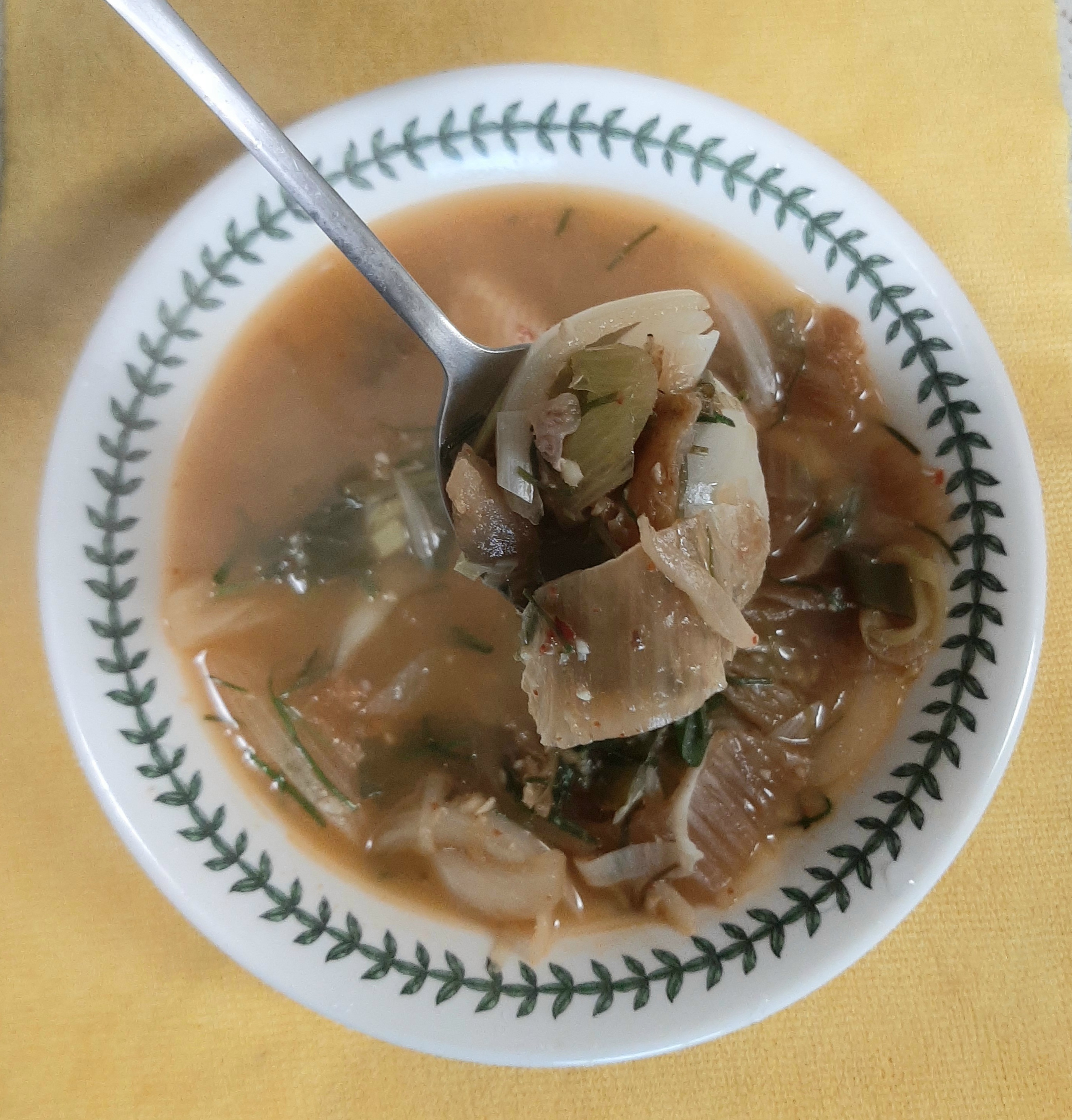 "깊게 발효된 2년 묵은 배추김치와 닭윙, 그리고 베란다 텃밭 달래 향이 어우러진 구수한 집밥 국물요리"