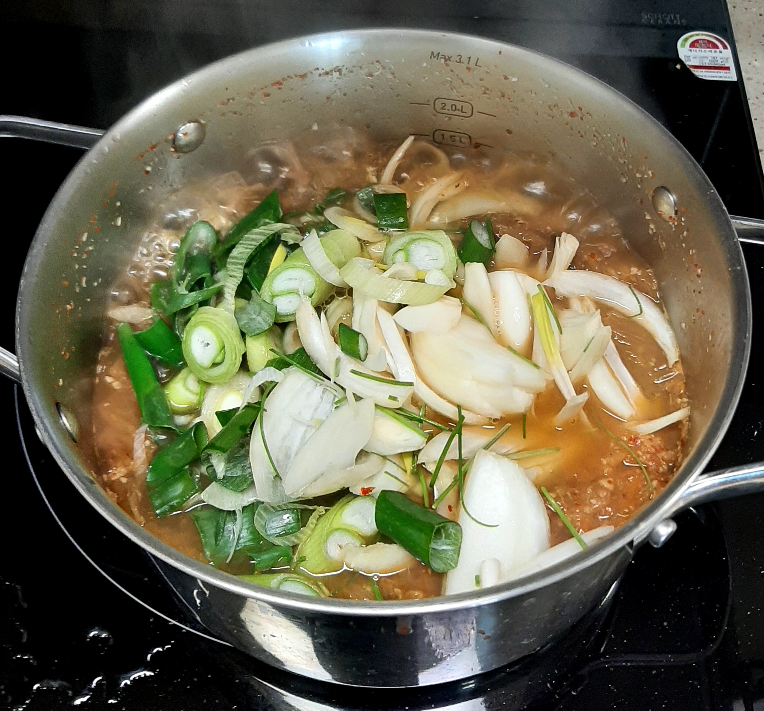 여기에 양파와 대파를 넣어 국물의 단맛을 더해 줍니다.