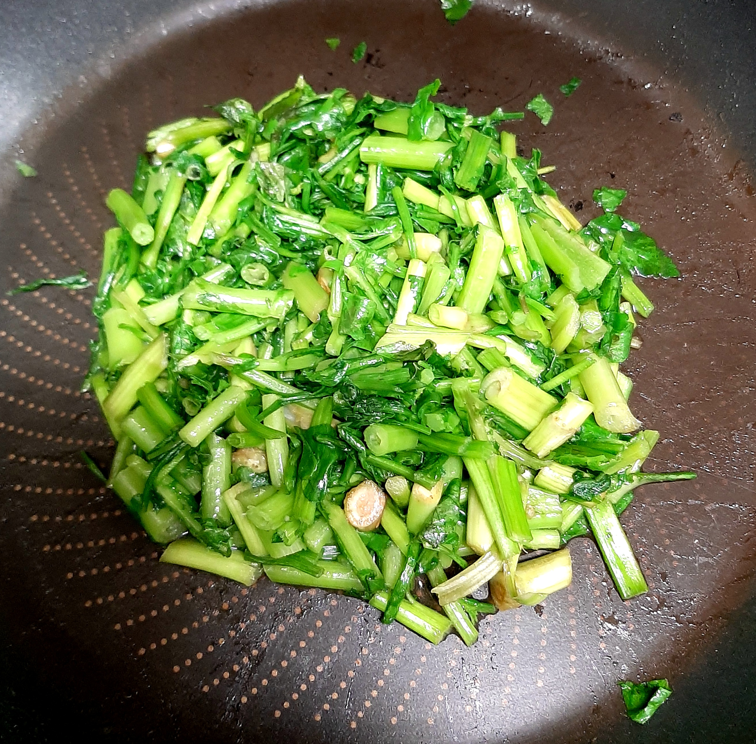 그 다음 후라이팬을 약한 불로 달군 뒤 돌미나리와 쑥갓을 살짝 볶아 줍니다.