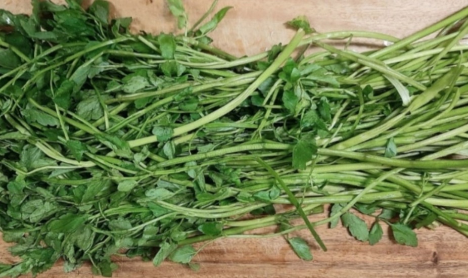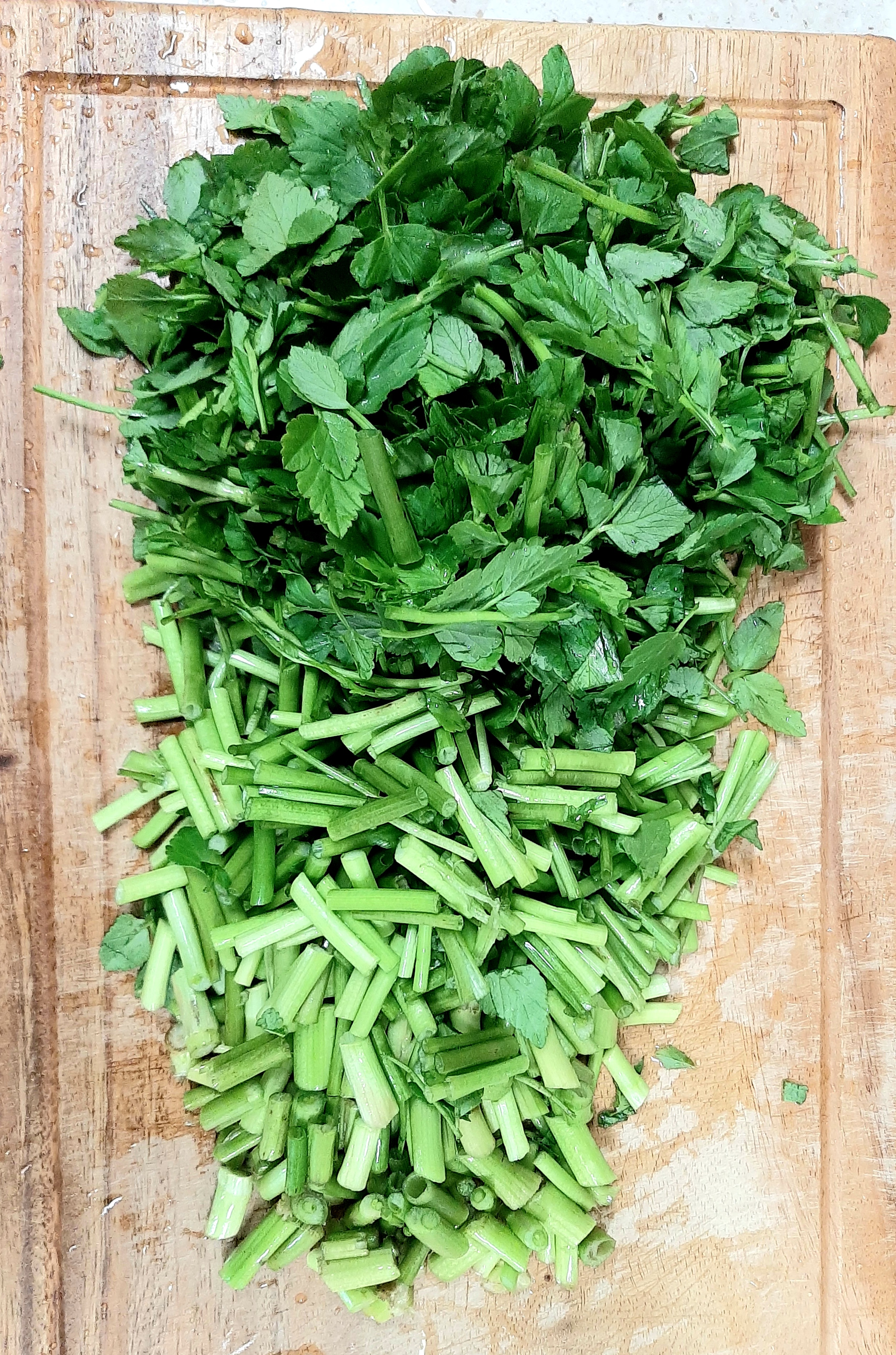 먼저 돌미나리와 쑥갓을 깨끗하게 씻어 준비합니다. 신선한 채소는 흐르는 물에 여러 번 씻어 흙이나 불순물을 제거하는 것이 좋습니다.