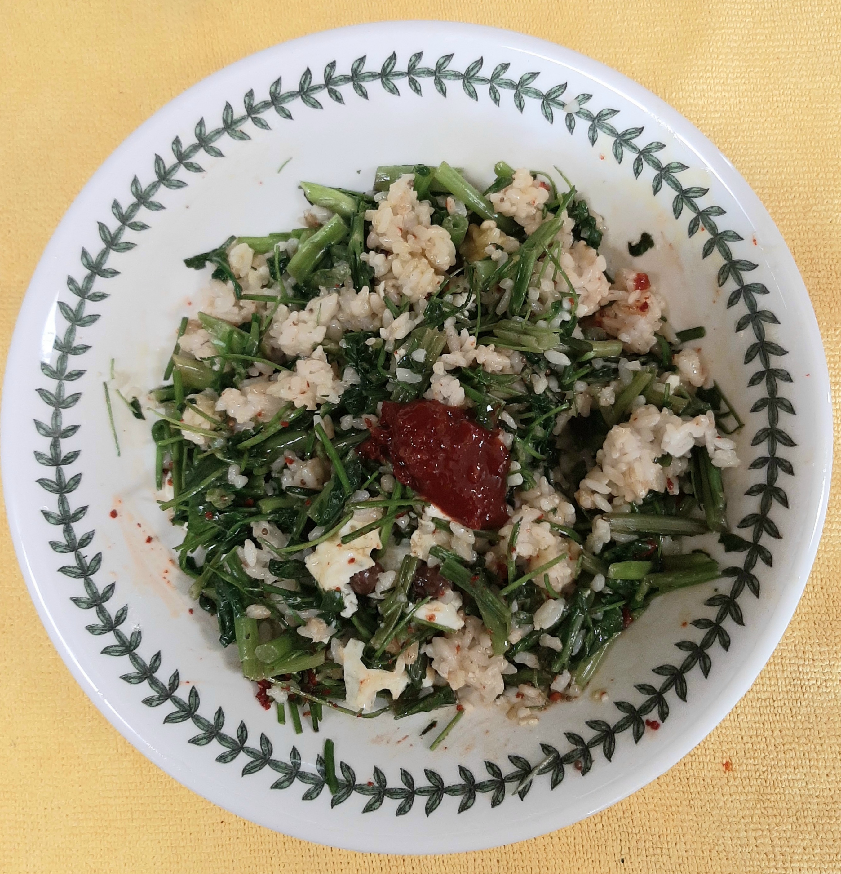 이제 숟가락으로 잘 비벼 주면 향긋한 돌미나리 쑥갓 비빔밥이 완성됩니다.