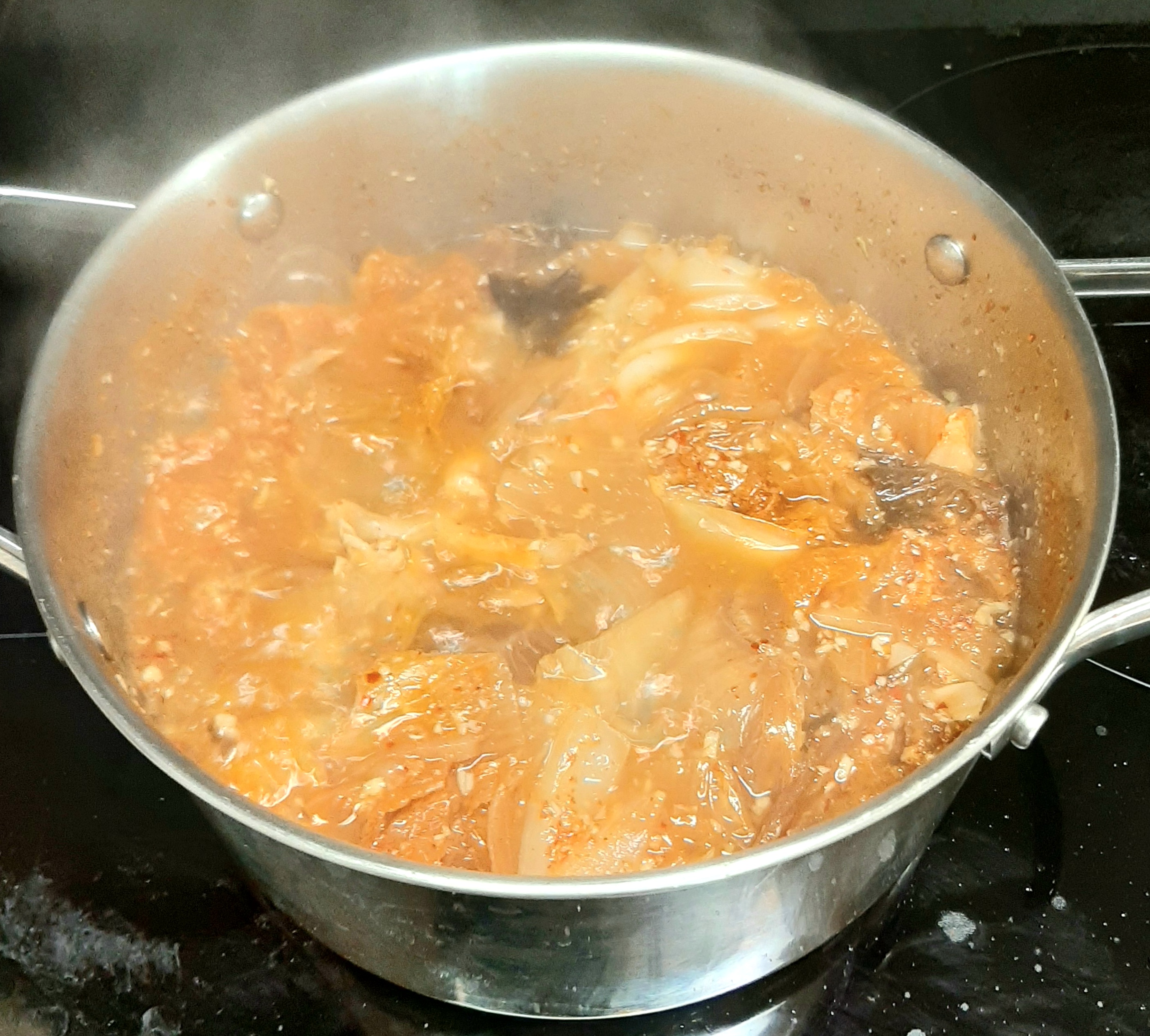 한동안 끓이다 보면 묵은지의 시원한 맛과 닭고기의 담백한 맛이 어우러지면서 깊은 국물이 완성됩니다.