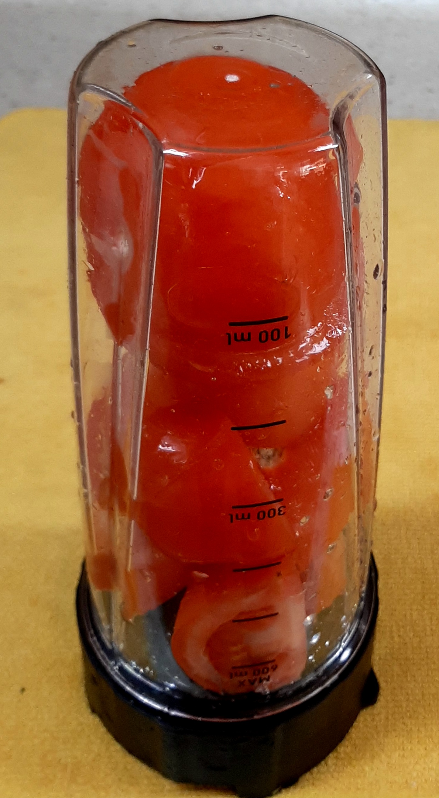 먼저 잘라 둔 토마토를 믹서기에 넣습니다.